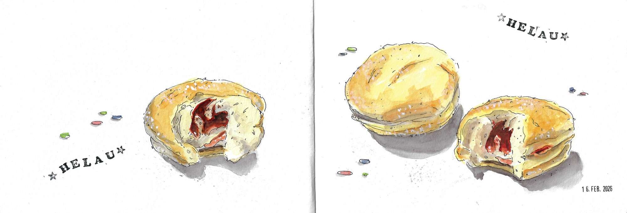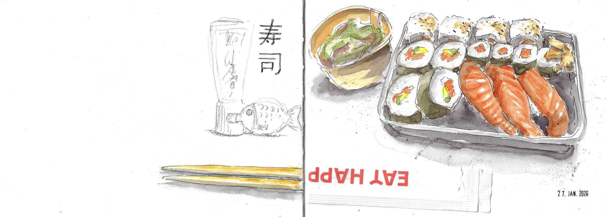 … und dann gibt es noch sog. Food Sketching. Bitte nicht mit Suppe beginnen, lieber mit Salat! Mit Stempeln bzw. mit Originalverpackung oder Teilen davon ergänzt und auf „spannendem“ DIN A5-Querformat: